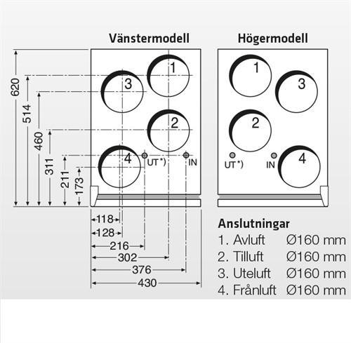 Toppansluten med ventilationsanslutning Ø160 mm.